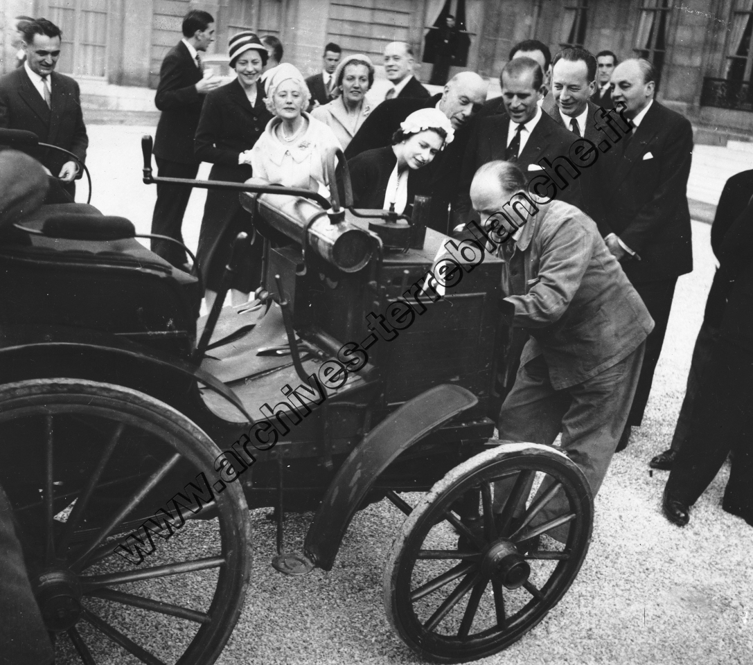 Visite de la Reine d'Angleterre au cours de laquelle Paul et Jean Panhard lui présentent L'"Ancêtre" de l'automobile dans la cour de l'Élysée