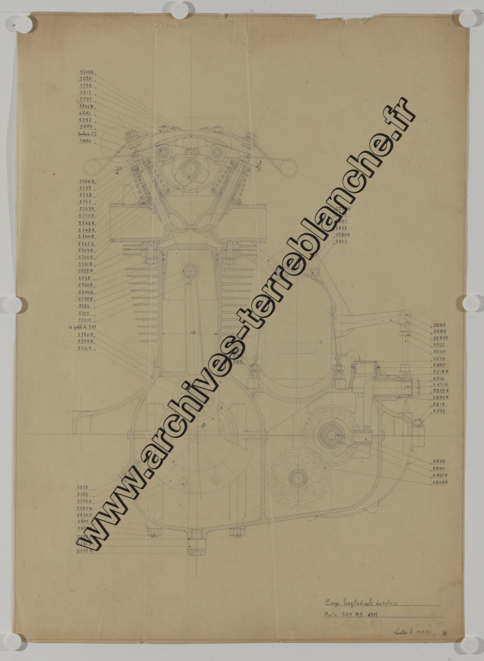 Motocyclette 500 M2 modèle 1927 - Moteur, coupe longitudinale : plan d'ensemble
