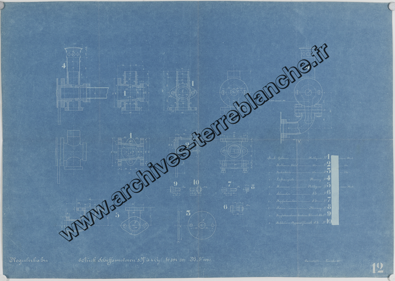 Moteur fixe Daimler [pour navires] n°394 à 399 B1087 5 chevaux 4 cylindres 6 pièces, sous ensemble vanne de régulation : vue d'ensemble