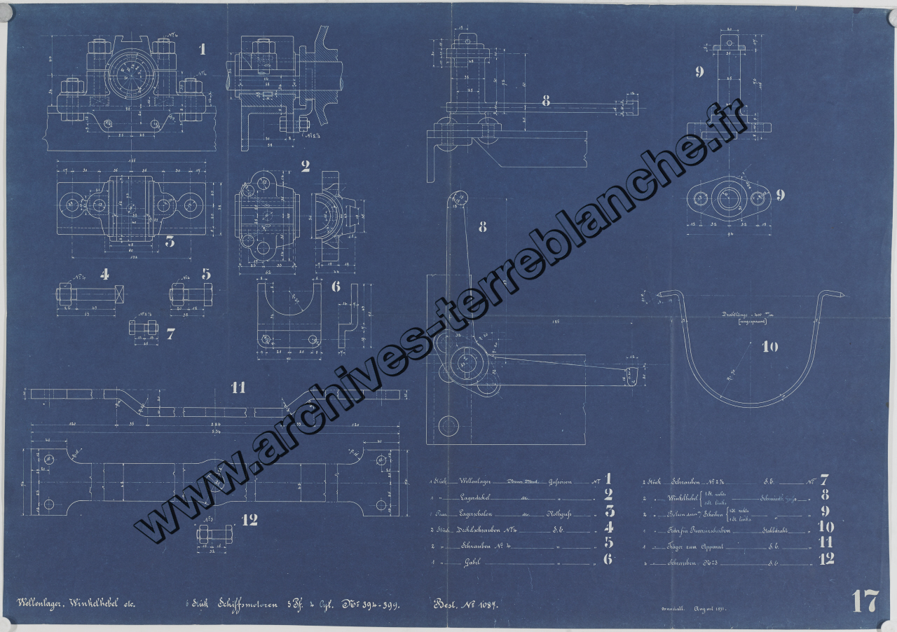 Moteur fixe Daimler [pour navires] n°394 à 399 B1087 5 chevaux 4 cylindres 6 pièces, sous ensemble palier d'arbre coudé : vue d'ensemble