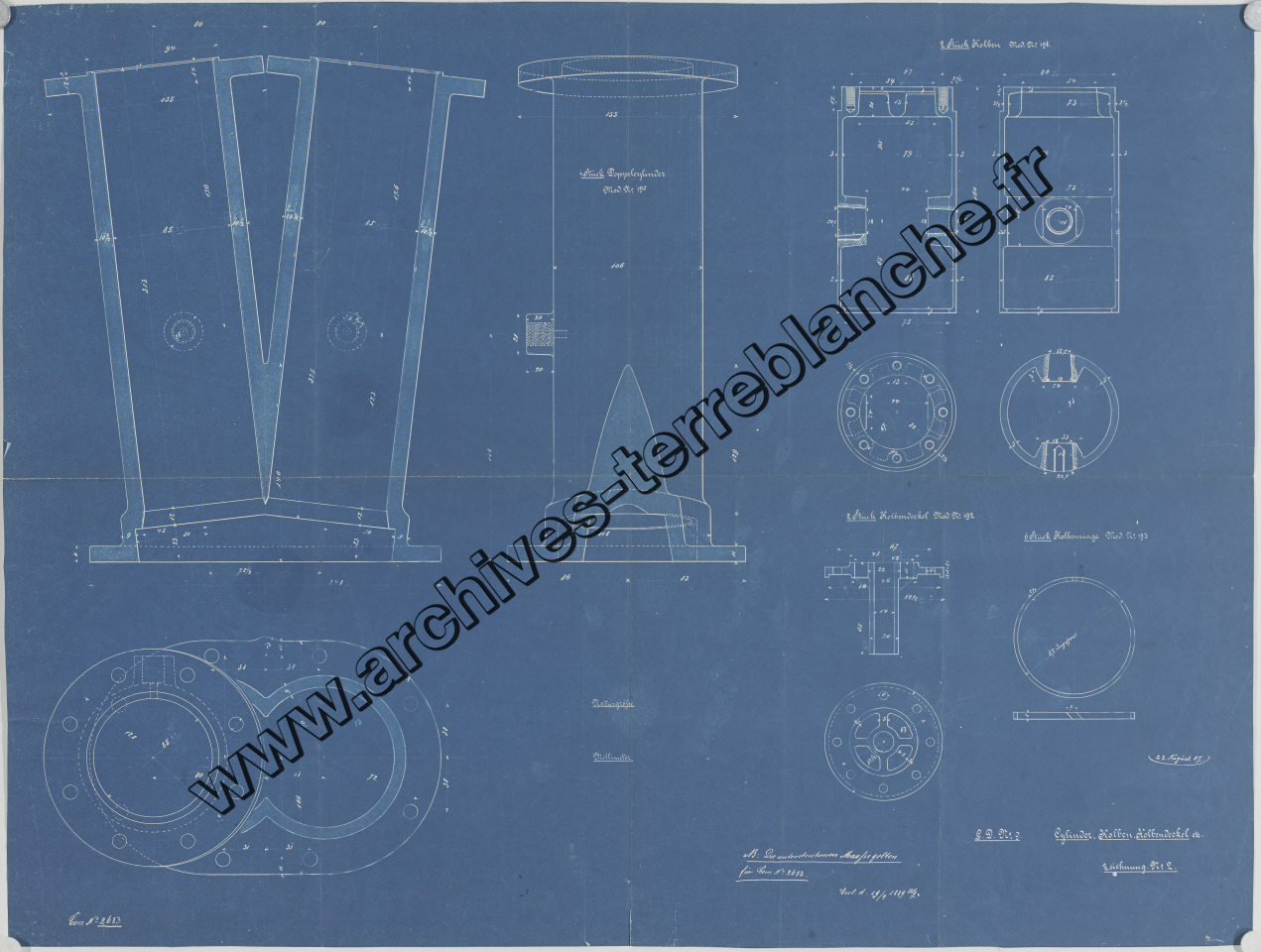 Moteur fixe Daimler [pour navires] B2683 4 chevaux 2 cylindres, sous ensembles cylindres et piston : plan d'ensemble