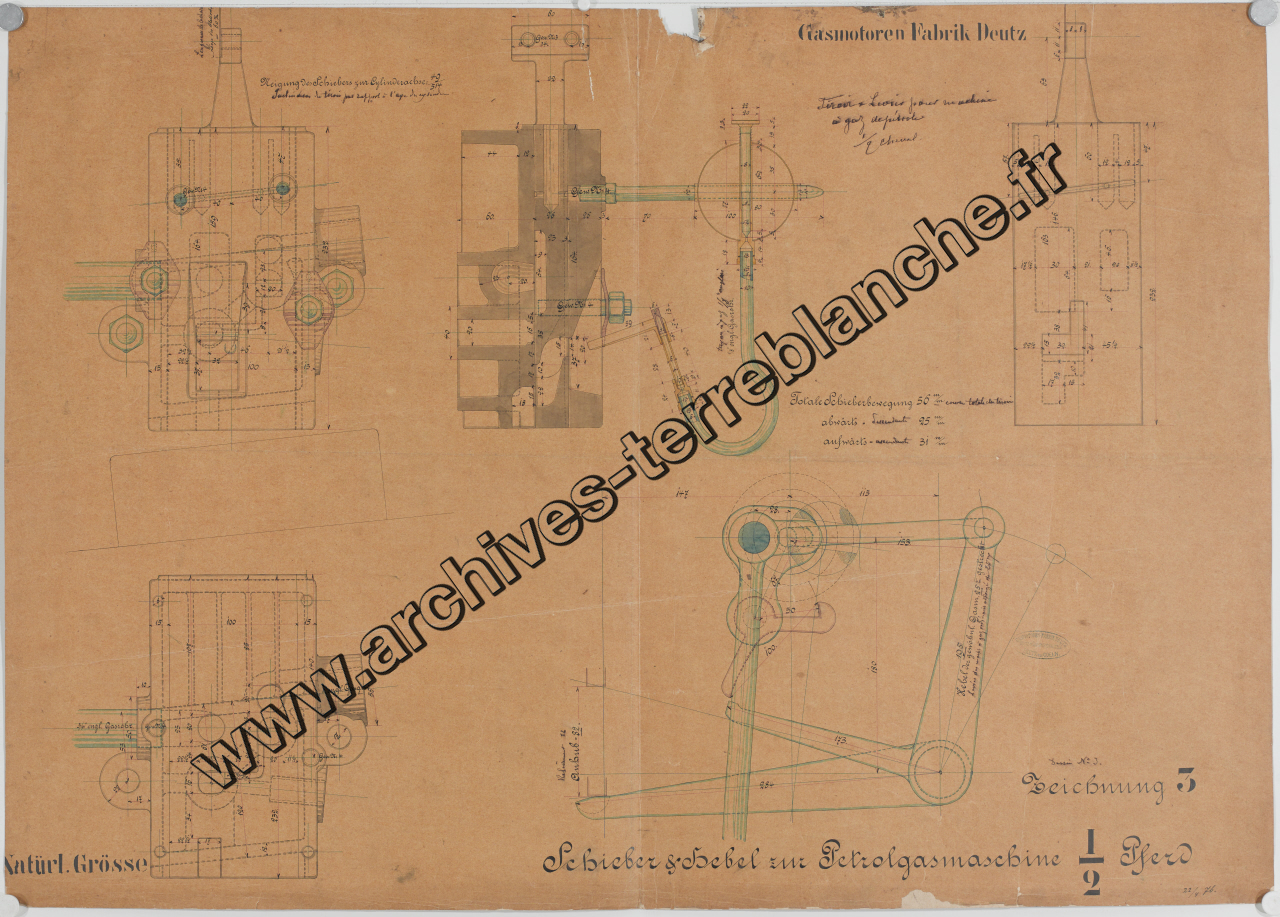 Moteur fixe Deutz [à gaz] 1/2 cheval, sous ensembles culasse et levier : plan d'ensemble