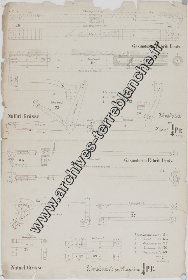 Moteur fixe Deutz [à gaz] 1/4 cheval, pièces en fonte [tige de poussée et bielles] : plan d'ensemble