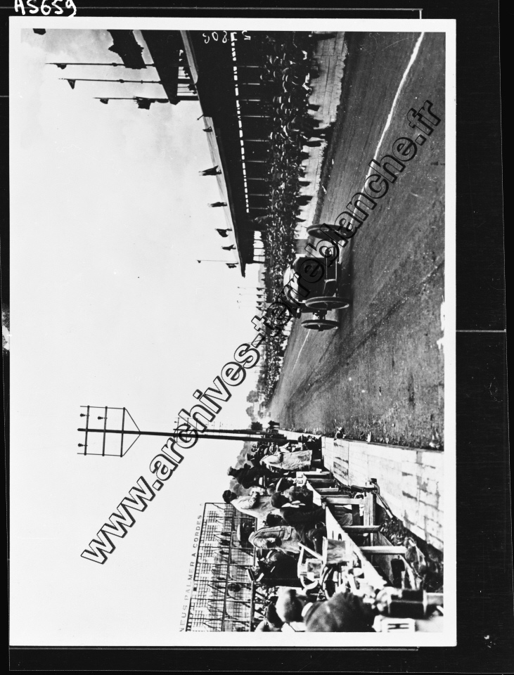 Grand Prix de l'Automobile Club de France (ACF) de Lyon.- Georges Boillot dans la Peugeot L76 EX5 n°5, spectateurs de part de d'autre du circuit.