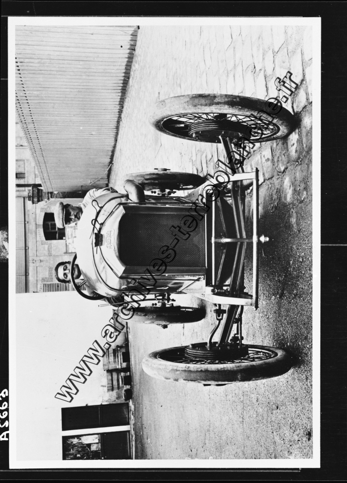 Grand Prix de l'Automobile Club de France (ACF) de Lyon. - Georges Boillot et son copilote dans une Peugeot L45 (4494 cm3) dans la cour de l'usine de Levallois au 77 rue Danton.