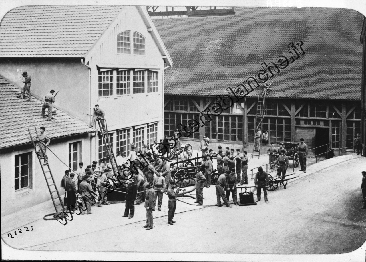Manœuvre des sapeurs-pompiers dans une cour d'usine à l'aide d'échelle et de lances à incendie.