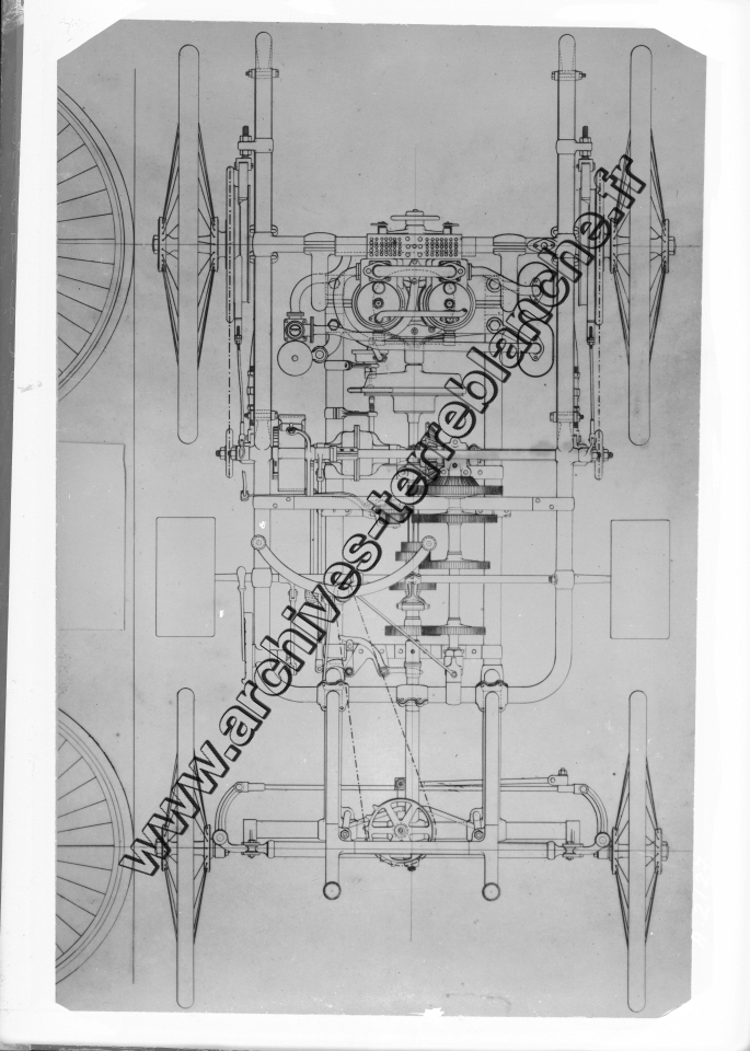 Plan d'un châssis de voiturette Peugeot équipée du moteur Panhard licence Daimler deux cylindres.