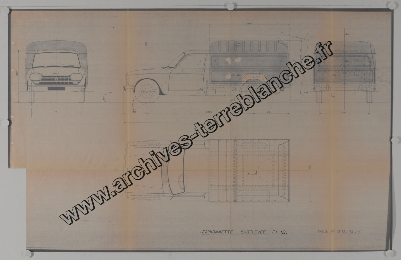 Automobiles Peugeot. - Projet D19 [camionnette 204], pneus avant et arrière camionnette surélevée.