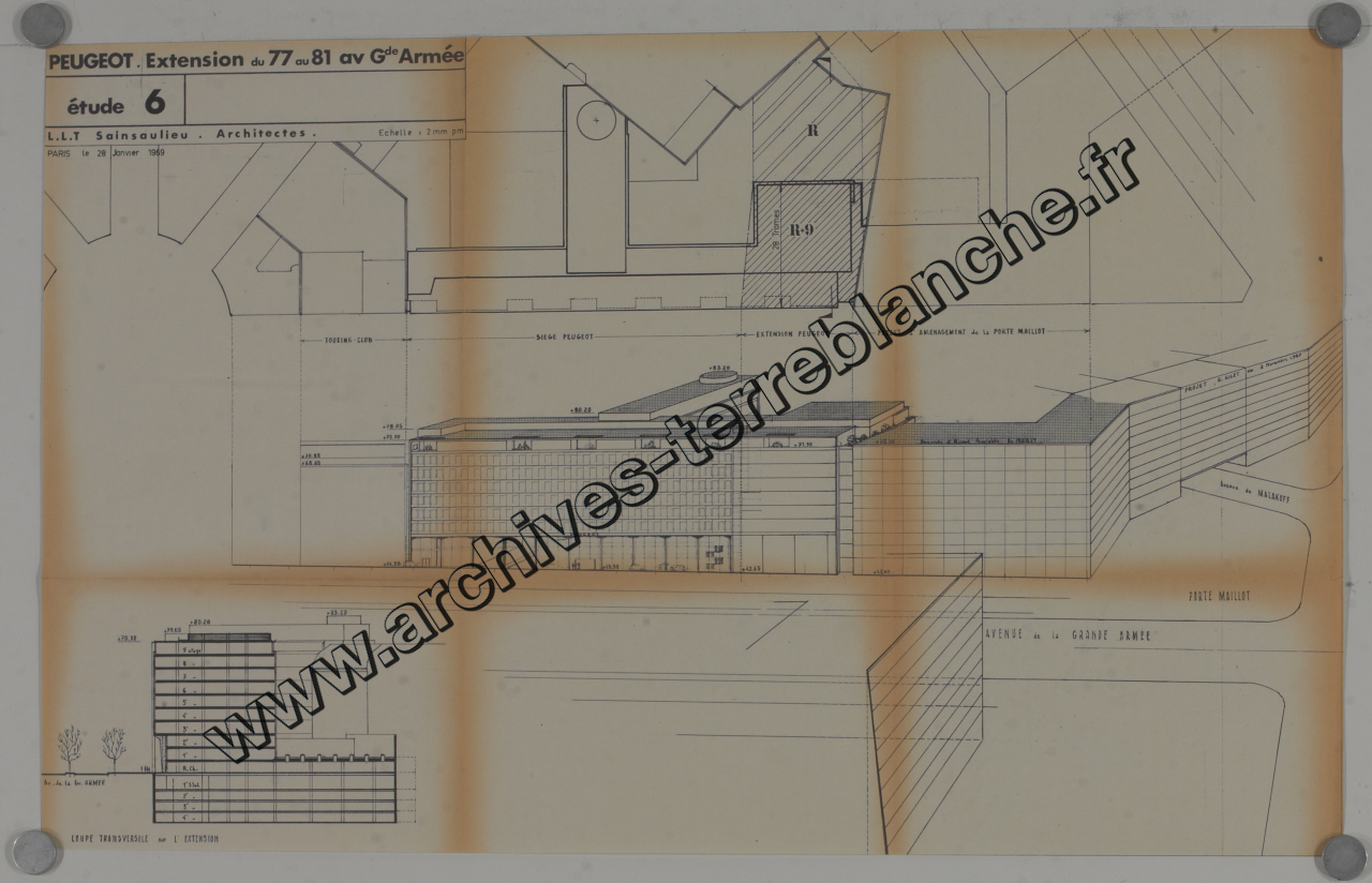 Peugeot SA. - Siège social de Grande Armée, étude d'extension : plan de situation, schémas, plans de sol, coupes, esquisses.
